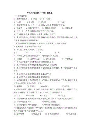 简介:劳动关系协调员(一级)模拟题劳动关系协调员(一级)模拟题一、单项选择题1晚婚年龄是男C周岁,女C周岁。A23,21B24,22C25,23D26,242国际劳工标准中,B一经批准,成员国必须遵守和执行。A建议书B国际劳工公约C国际贸易协定D推荐标准3以下D没有正确描述国际劳工立法的目标。A只有以社会正义为基础,才能建